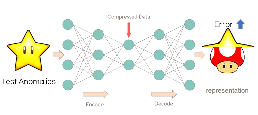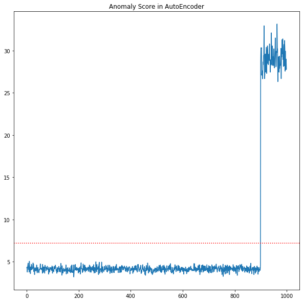 One Class 기반 이상 탐지를 위해서는 정상 데이터를 사용하여 AutoEncoder를 훈련시킨다. 그 후, 훈련시킨 모델에 테스트 데이터를 입력값으로 넣어 발생한 오차가 클수록 이상 개체라고 판단한다. 이 값을 그대로 이상 점수로도 사용할 수 있다.