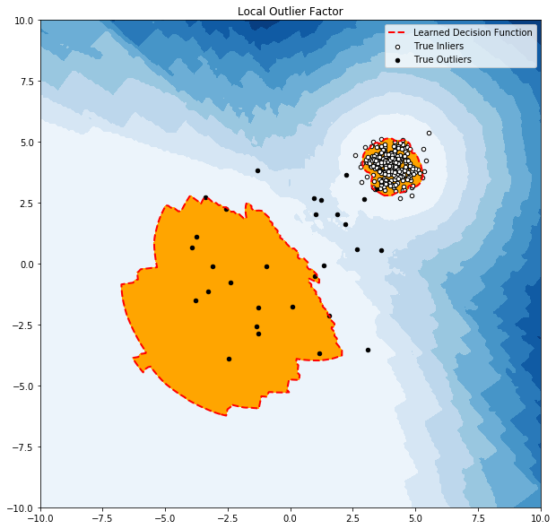 이러한 문제를 통해, Local의 상대적인 밀도를 비교하여 Outlier를 정하는 LOF(Local Outlier Factor) 기법이 등장했다. 가장 가까운 k 개 점들의 local density의 평균과 자기 자신의 local density 밀도의 비율로 정의된다.