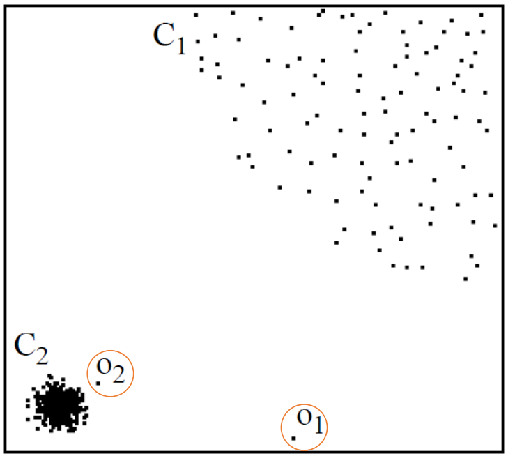 밀도 기반 기법은 각 관측값 근방의 밀도를 추정한다. 근방의 밀도가 낮은 관측값은 이상값이라 판단한다. 이러한 기법은 영역에 따라 밀도가 다를 때 취약하다. 즉, 밀도가 상이한 클러스터들이 존재할 때 문제가 발생한다. 기존의 밀도 기반 방법론들은 ‘밀도’라는 개념을 정의하기 위해, 특정 Window Size 및 최소 개수 등을 이용했다. 예를 들면, ‘거리가 c 이하인 Window 내 존재하는 데이터가 k 개 이상인가?’ 를 밀도로 지정하였다. 그러나, 클러스터별 밀도가 상이한 경우, 기존의 방법론처럼 밀도에 대한 절대적인 기준을 지정할 수 없어진다. k-NN 방법론 역시, 각 클러스터에 대한 Outlier를 찾기 위한 적절한 kNN Distance가 달라진다. 다음 그림을 보면 이해가 빠르다. O3는 두 집단의 밀도가 다르기 때문에 상대적으로 걸러내기 쉽다. 그러나, O4는 걸러내기 어렵다. 좌측 클러스터와 우측 클러스터의 밀도가에만 특화된 Outlier Detection을 수행하게 된다.