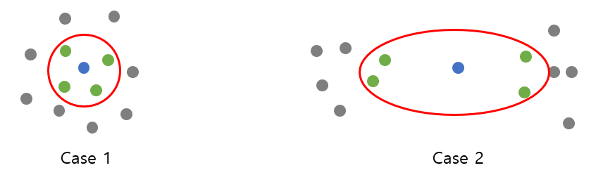 | 위 식에서 분자를 보면 A에 속한 B의 Local Reachability Density의 평균을 | N_k | 로 나눴다는 것을 알 수 있다. 따라서 LOF Score는 A가 얼마나 이상치인가를 나타내는 정도라고 볼 수 있을 것이다.그림을 통해 좀 더 쉽게 이해해보겠다. |