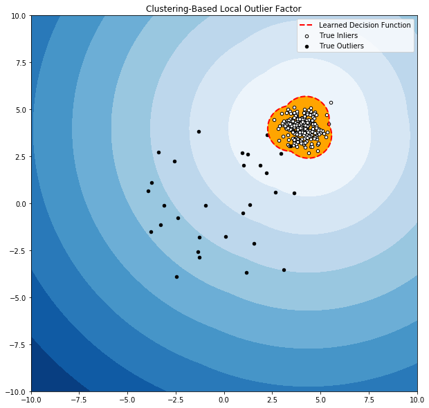 세 번째 종류는 ‘정상값은 크거나 조밀한 군집에, 이상값은 작거나 희소한 군집에 속한다’라고 가정한다. 관측값이 속한 군집의 크기나 밀도가 이상 여부를 판단하는 기준이 된다. FindCBLOF(Find Clustering-Based Local Outlier Factor)에서는 관측값이 속한 군집의 크기 및 관측값과 그 군집의 중심 사이의 거리를 반영하는 방법이다.